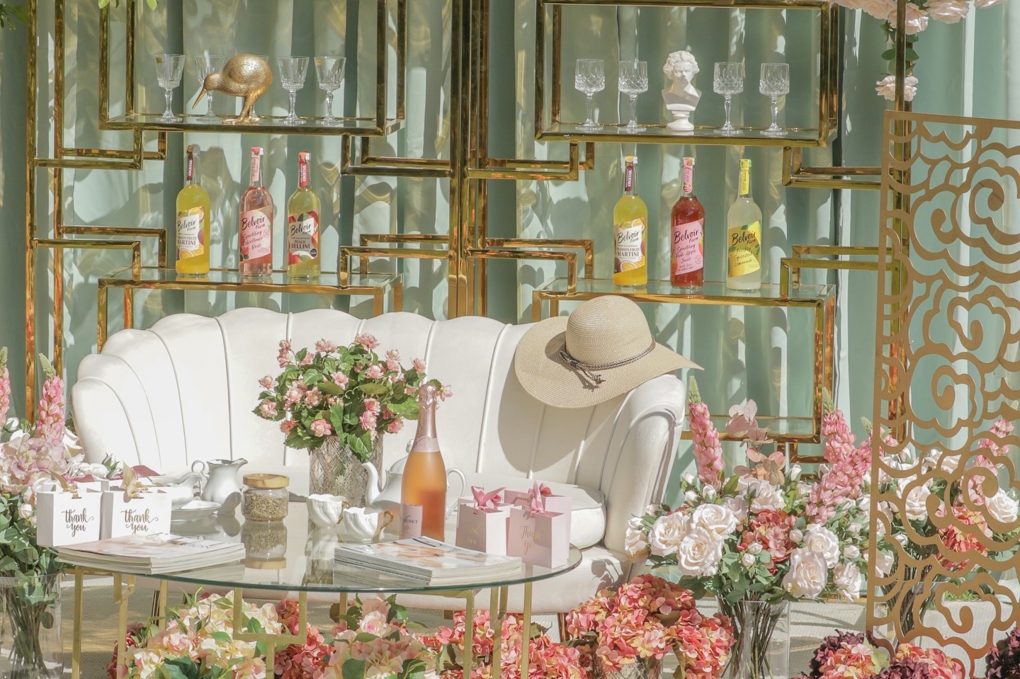 2 Gold Glass shelves for glasses and drinks and florals.